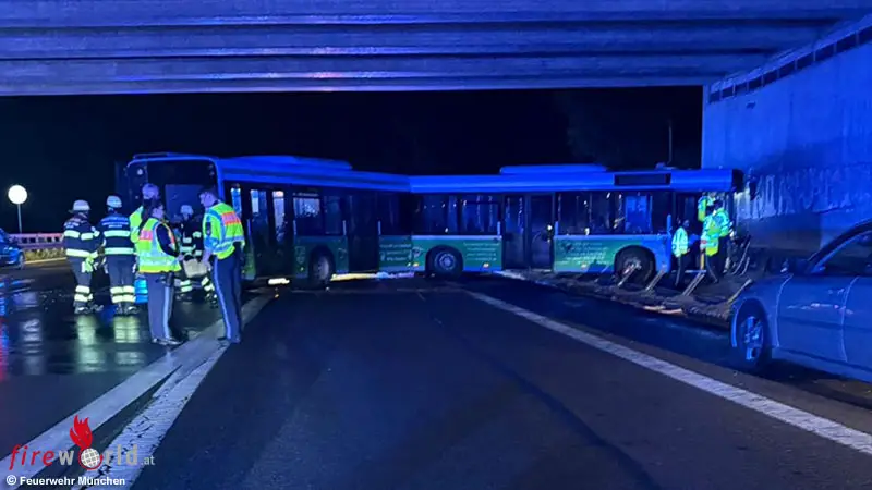 Aus unbekannter Ursache kollidierte ein Linienbus auf der A 96 in Fahrtrichtung München auf Höhe der Westendstraße mit der Leitplanke. Infolgedessen stieß der Bus, in dem sich keine Fahrgäste befanden, frontal mit dem Auflager einer Brücke zusammen. Der Fahrer wurde hierbei schwer verletzt und musste in ärztlicher Begleitung von einem Rettungswagen in den Schockraum einer Münchner Klinik gebracht werden.