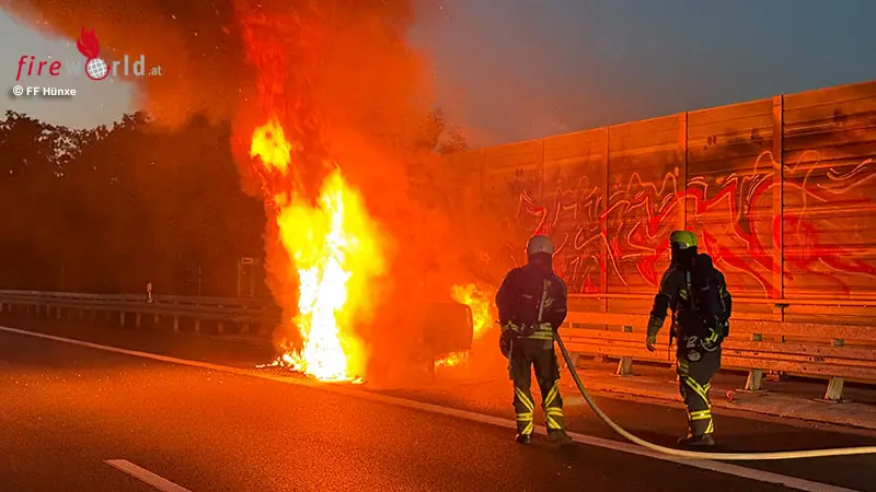 HÜNXE (DEUTSCHLAND): Die Einheiten Hünxe und Drevenack wurden am 10. August 2025 um 21:25 Uhr mit dem Einsatzstichwort „Pkw-Brand“ auf die BAB 3 in Fahrtrichtung Niederlande alarmiert. Da die genaue Einsatzörtlichkeit zunächst unklar war, wurde zusätzlich die Freiwillige Feuerwehr Hamminkeln alarmiert.
