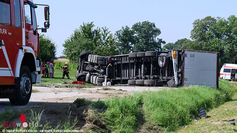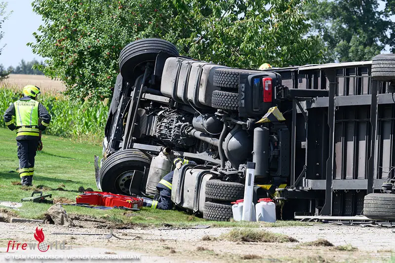 Oö: Lkw-Unfall bei St. Marien → Sattelzug stürzt um – Fahrer unverletzt
