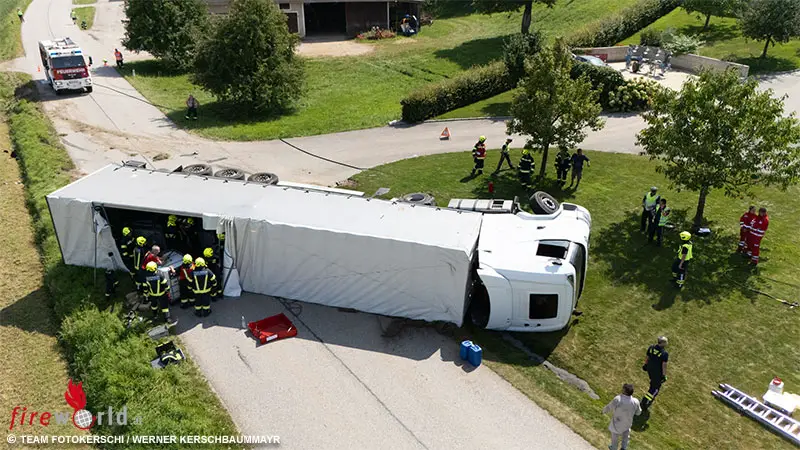 ST. MARIEN (OÖ): Am frühen Nachmittag des 14. August 2025 kam es auf einer Straße bei St. Marien zu einem Verkehrsunfall mit einem Lkw-Sattelzug.