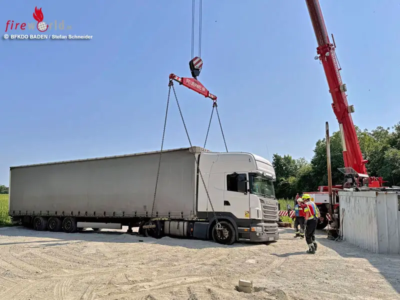 Nachdem mehrere Befreiungsversuche missglückten und sich die Zugmaschine des Schwerfahrzeuges immer tiefer in dem frisch aufgeschütteten Sandplatz eingrub, wurde die Feuerwehr um Hilfe gebeten.