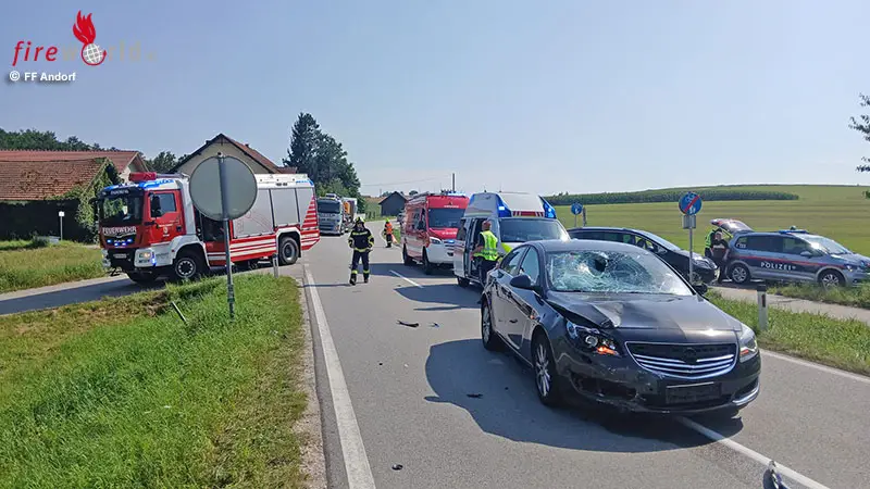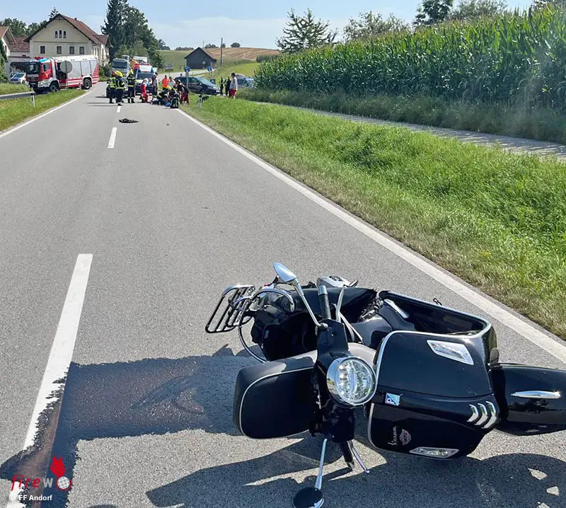 ANDORF (OÖ): Am Nachmittag des 14. August 2025 wurde die Feuerwehr Andorf zu einem schweren Verkehrsunfall auf der Andorfer Landesstraße L514 auf Höhe der Ortschaft Edt beim Pfarrhof alarmiert. Ein in Richtung Sigharting fahrender Motorradlenker wollte nach links in einen Feldweg abbiegen, was ein nachkommender Pkw-Lenker aus noch unbekannten Gründen offensichtlich übersah.
