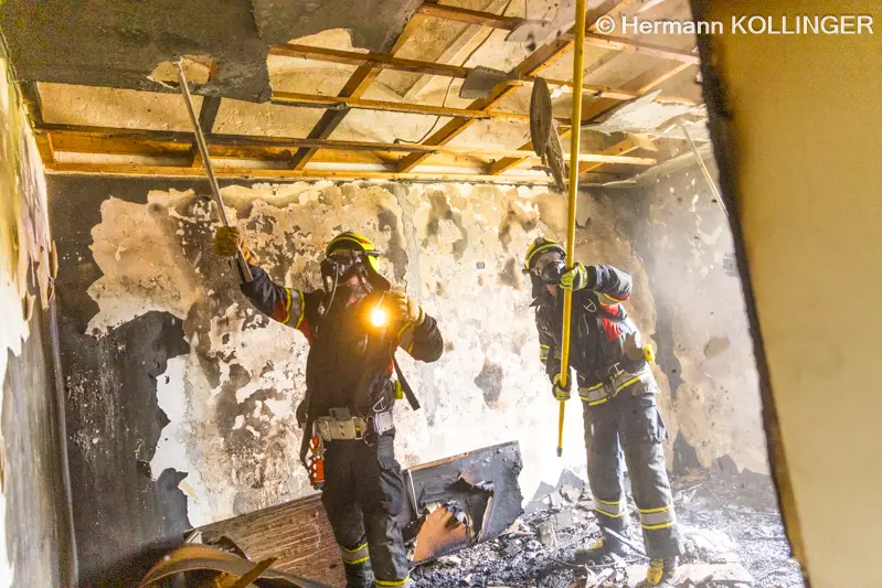 Hochleistungslüfter wurden platziert und damit der Rauch aus dem Gebäude gedrückt. In weiterer Folge war es erforderlich, einen Teil der Deckenkonstruktion im Bereich des vom Feuer betroffenen Zimmers abzureißen. Die Wohnung ist nach der intensiven Rauchbeaufschlagung unbewohnbar.