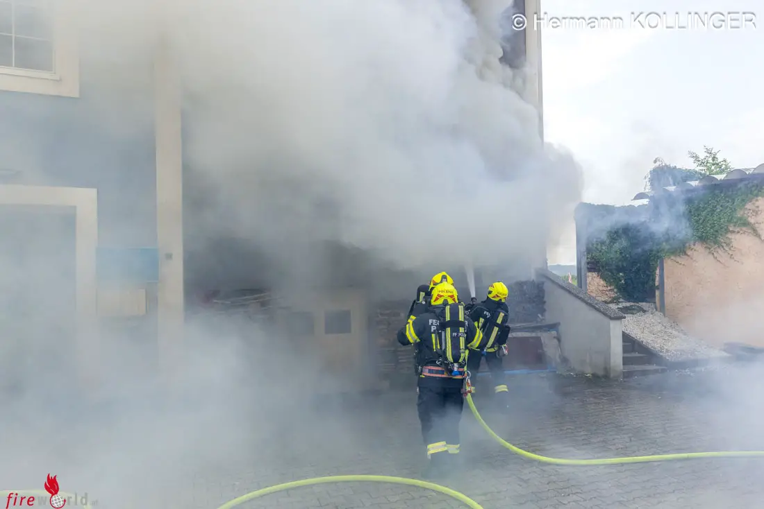 ALKOVEN (OÖ): „Brand Gebäude, Flammen aus dem Erdgeschoß, Straß“ – mit diesen Einsatzstichworten wurden die Feuerwehren Alkoven und Polsing (Bezirk Eferding) am Samstag, dem 16. August 2025 neuerlich zu einem Brand alarmiert, der sogar die Sichtbedingungen auf der B 129 stark einschränkte.