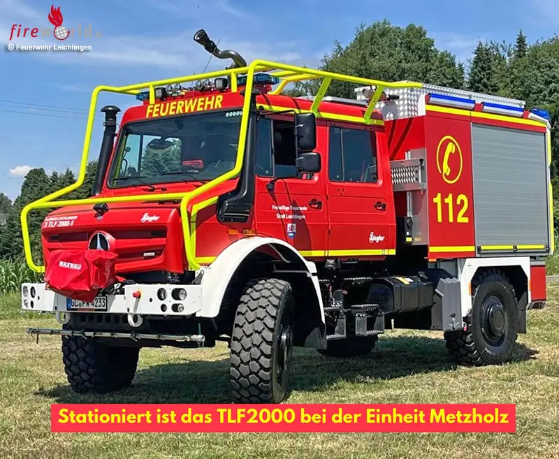 Das TLF2000 auf Unimog Fahrgestell, aufgebaut von der Firma Ziegler, wird zukünftig bei der Einheit 3 in Metzholz stationiert sein und ersetzt ein in die Jahre gekommenes Löschgruppenfahrzeug (LF 8/6). Es ist ausgestattet mit einem 2000 Liter Löschwasserbehälter, einem auf dem Dach montierten Wasserwerfer, weiterhin verfügt das Fahrzeug über zwei Dachluken aus denen Einsatzkräfte zwei handgeführte Strahlrohre vornehmen können. Über diese Dachluken können aber auch Personen gerettet werden z.B. bei einem Hochwasser, auf dem Dach sind zusätzlich Halterungen verbaut um auch dort Personen aufzunehmen und in gesicherte Bereiche zu bringen.