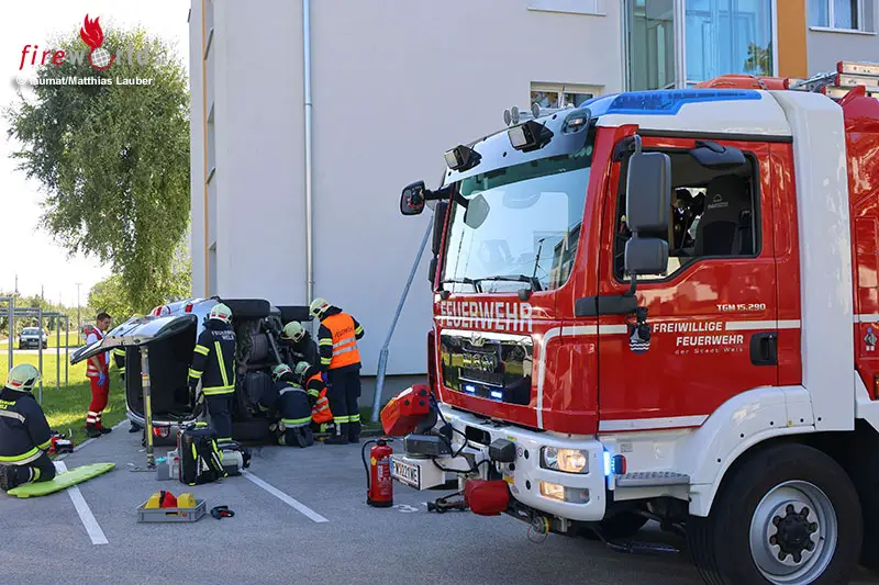WELS (OÖ): Die Feuerwehr wurde am späten Dienstagnachmittag, 19. August 2025, gemeinsam mit dem Rettungsdienst und der Polizei zu einem Unfall auf dem Parkplatz eines Mehrparteienwohnhauses in Wels-Vogelweide alarmiert.