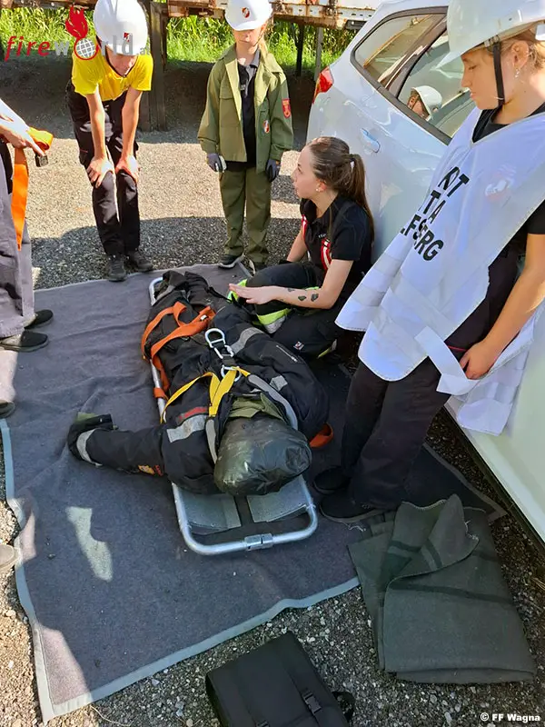 Erste Alarmübung: Verkehrsunfall mit eingeklemmter Person. Nach Absicherung, Brandschutz, Unterbau des Pkw und Errichtung des Sanitätsplatzes begann die Menschenrettung mittels hydraulischem Rettungsgerät. Anschließend wurde das Fahrzeug mittels Seilwinde aufgerichtet. Mittags fanden Teamspiele zur Koordination, Teamgeist und Gemeinschaft statt.