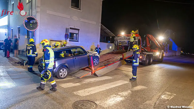 Zur Bergung des Minis positionierte sich das Wechselladefahrzeug mit Kran so, dass er mittels der Seilwinde des Bergeplateaus verladen werden konnte. Der Familienvan wurde mit Muskelkraft zurück auf die vier Räder gekippt und anschließend auf einen Parkplatz geschoben. Der Mini wurde von Last 4 Krems zu einem gesicherten Abstellplatz verbracht.