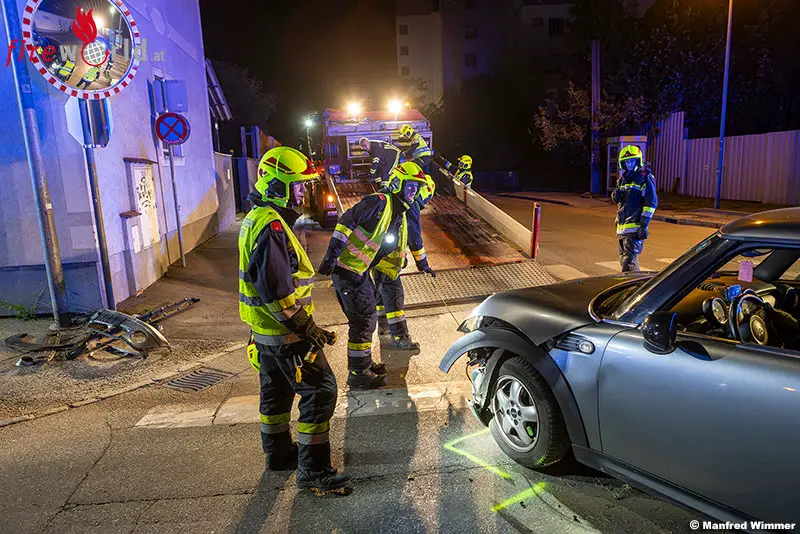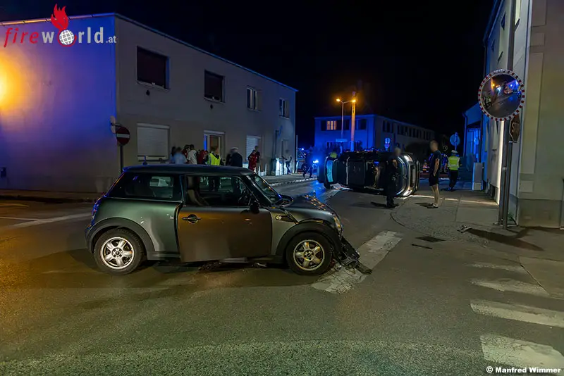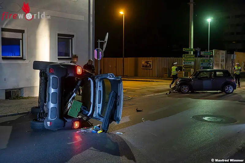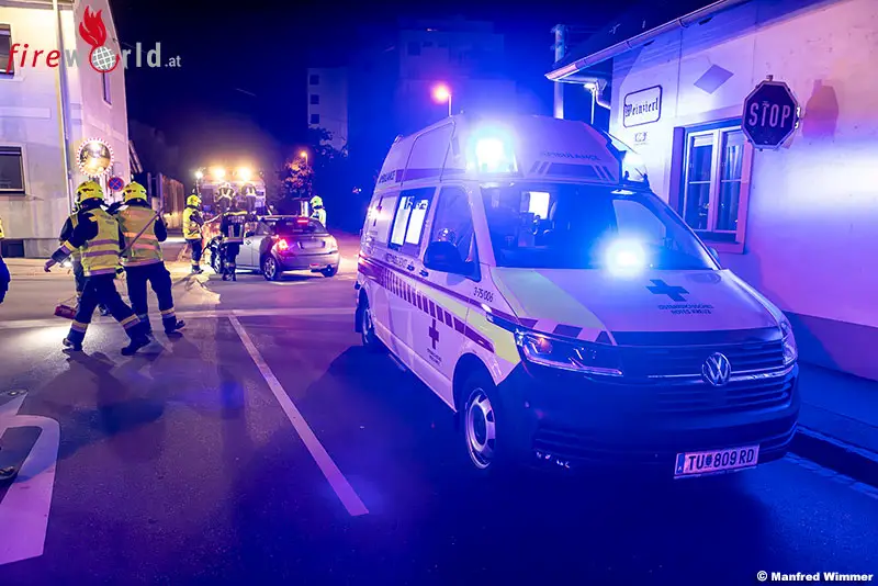 KREMS AN DER DONAU (NÖ): In der Nacht auf Dienstag, den 26. August 2025, ereignete sich auf der Hafenstraße ein Verkehrsunfall zwischen zwei Fahrzeugen. Durch den Aufprall kippte ein Familienvan um und blieb seitlich auf der Fahrbahn liegen. Ersthelfer reagierten vorbildlich und setzten unverzüglich die Rettungskette in Gang. Da zunächst unklar war, ob einer der vier Insassen im Van – darunter zwei Kinder – oder die Fahrerin des Minis eingeklemmt war, alarmierte der Diensthabende die Feuerwachen Gneixendorf und Hauptwache mit Alarmstufe T2.