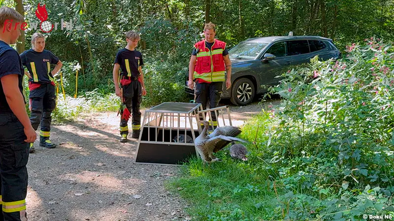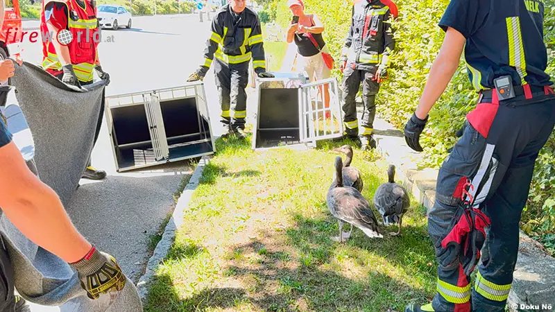 MELK (NÖ): Am Nachmittag des 25. August 2025 wurde die Freiwillige Feuerwehr Melk zu einer Tierrettung beim Einkaufszentrum Löwenpark alarmiert. Aufmerksame Passanten meldeten drei offensichtlich erschöpfte, jedoch unverletzte Wildgänse, die sich im Bereich des Einkaufszentrums niedergelassen hatten.