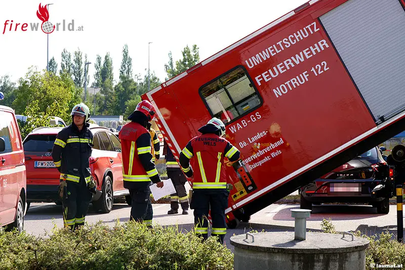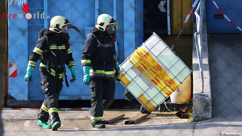 WELS-PUCHBERG (OÖ): Feuerwehr, Rettung und Polizei standen Montagnachmittag, den 25. August 2025, auf dem Betriebsgelände eines Speditionsunternehmens in Wels-Puchberg im Einsatz. Offenbar bei Verladearbeiten dürfte ein sogenannter IBC-Container – ein Gittertankcontainer auf einer Palette – beschädigt worden sein, wodurch der Stoff des Behälters – Antimontrichlorid, ein in erster Linie ätzender Stoff – auszutreten begann.