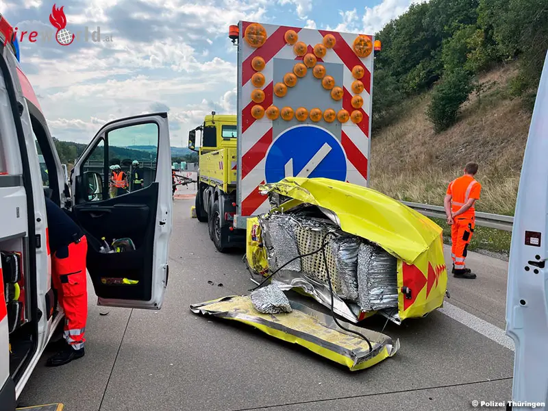 BAD LOBENSTEIN (D): Gegen Mittag ereignete sich am 27. August 2025 ein schwerer Verkehrsunfall auf der A9 in Fahrtrichtung München. Zwischen den Anschlussstellen Schleiz und Bad Lobenstein fuhr ein Transporter mit Anhänger auf einen Schilderwagen auf. Dieser stand zur Absicherung einer Baustelle auf dem rechten Fahrstreifen.