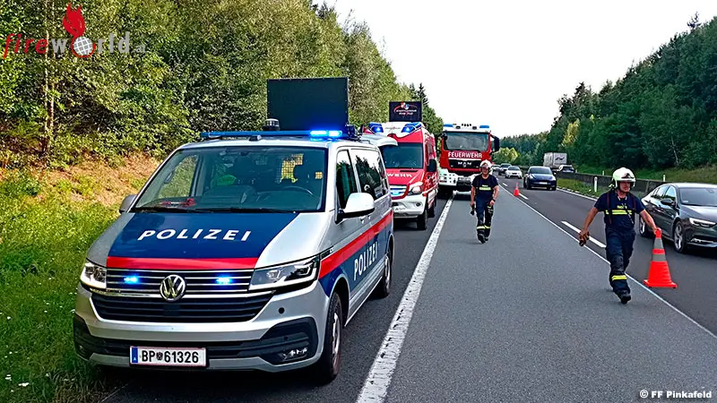 PINKAFELD (BGLD): Am späten Nachmittag des 28. August 2025 wurde die Freiwillige Feuerwehr Pinkafeld mittels Rufempfänger zu einem Verkehrsunfall auf die A2 Richtungsfahrbahn Wien zwischen Pinkafeld und der Betriebsumkehr Pinggau alarmiert. Die FF Pinkafeld rückte mit einem ELF (Einsatzleitfahrzeug), einem SRF (schweres Rüstfahrzeug), einem RLF (Rüstlöschfahrzeug) und achtzehn Mann zum Einsatz auf die A2 aus.