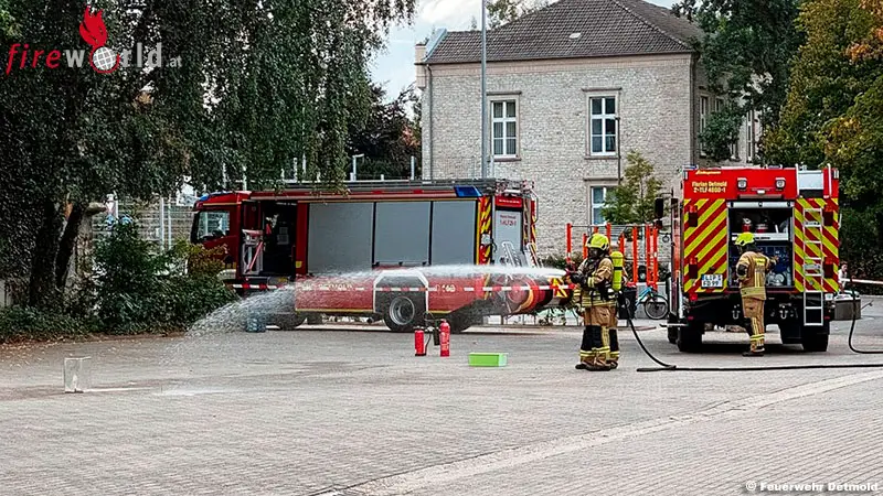 DETMOLD (D): Am Freitag, den 29. August 2025, um 13.35 Uhr wurde die Feuerwehr Detmold zum Gymnasium Leopoldinum an der Hornschen Straße gerufen. In einem Chemieraum war festgestellt worden, dass ein Behälter mit Natrium undicht geworden war und bereits leicht mit Feuchtigkeit in Kontakt stand.