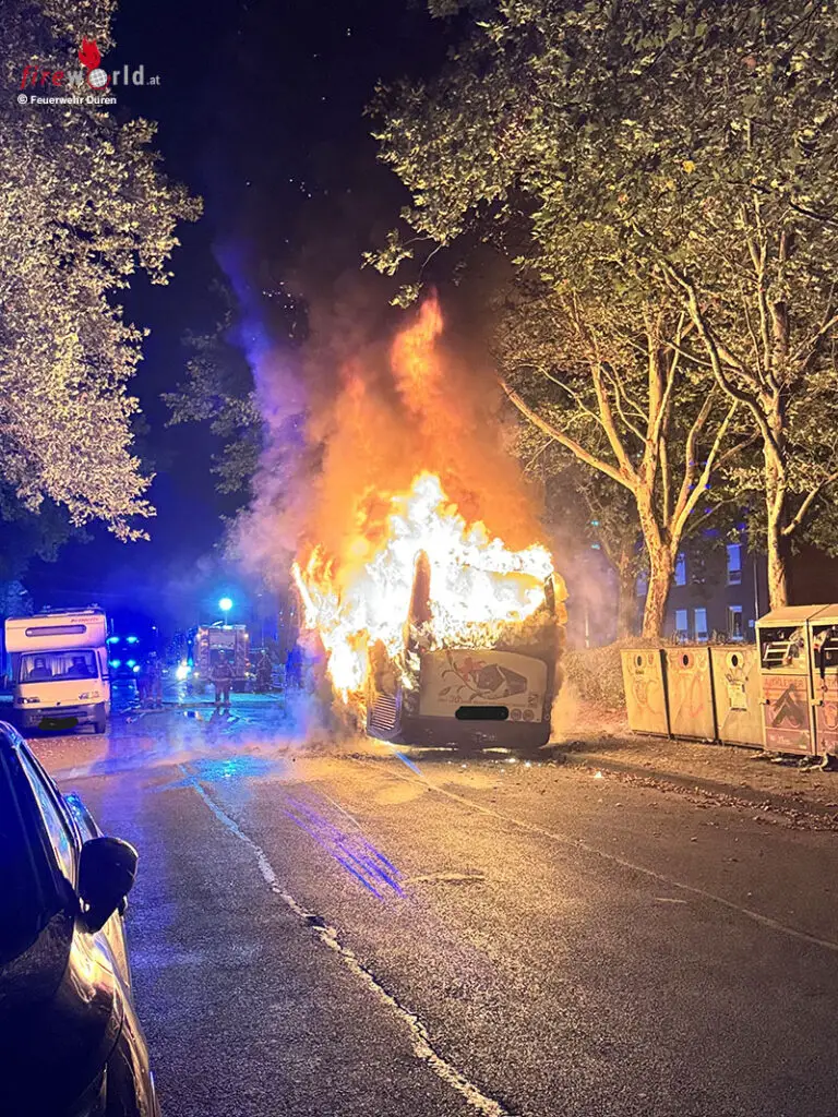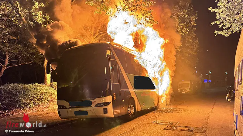 Beim Eintreffen der Einsatzkräfte stellte sich heraus, dass dort Kabel in Brand geraten waren. Das Feuer konnte zügig gelöscht werden. Wenige Minuten später folgte die nächste Alarmierung: In der Blücherstraße wurde ein brennender Reisebus gemeldet. Weitere Einheiten der Feuerwehr Düren wurden umgehend zur Einsatzstelle entsandt. Beim Eintreffen stand der Bus im Heckbereich in Flammen.