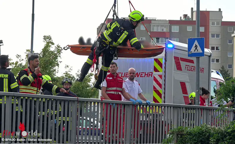 Binnen weniger Minuten trafen dann weitere Feuerwehreinsatzkräfte, sowie die ebenfalls alarmierten Rettungskräfte samt Notärztin und mehrere Polizeistreifen vor Ort ein. Der unbestimmten Grad verletzte Mann wurde zuerst mit einer Schaufeltrage schonend aus dem Wasser aufgenommen, in Folge mit einer Rettungswanne und Ladekran durch die Feuerwehr aus dem Flussbett auf die Brücke gehoben und der Notärztin zur weiteren medizinischen Versorgung übergeben.