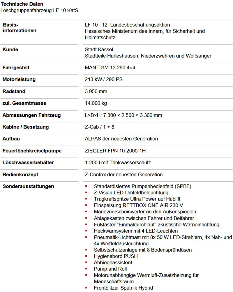 Die Fahrzeuge basieren auf einem MAN TGM 13.290 4×4 mit einem Radstand von 3.950 mm und einer Motorleistung von 213 kW (290 PS). Mit einer zulässigen Gesamtmasse von 14 Tonnen und kompakten Abmessungen (L×B×H: 7.300 × 2.500 × 3.300 mm) bieten die LF 10 KatS höchste Wendigkeit und Effizienz – auch unter herausfordernden Einsatzbedingungen.