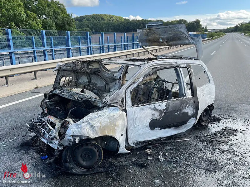 BIELEFELD (DEUTSCHLAND): Am Dienstagmorgen, 2. September 2025, geriet ein Auto auf der A2 nach einer Kollision mit einem weiteren Auto in Brand. Zwei Personen erlitten leichte Verletzungen.