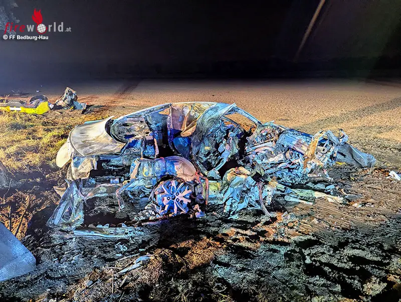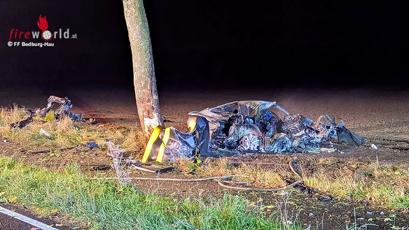 Beim Eintreffen der Feuerwehr stand ein Pkw, der zuvor gegen einen Baum geprallt war, in Vollbrand. Eine Person befand sich noch im Fahrzeug eingeschlossen, zwei weitere Personen wurden im Nahbereich liegend aufgefunden. Unverzüglich leiteten die Einsatzkräfte unter schwerem Atemschutz Löschmaßnahmen mit einer Schnellangriffsleitung ein. Das Feuer konnte schnell unter Kontrolle gebracht und abgelöscht werden. Das Fahrzeug brannte jedoch vollständig aus.