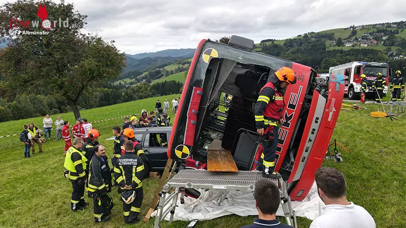 Die Ausbildner der Feuerwehr Altmünster hatten eine komplexe Einsatzlage vorbereitet. Angenommen wurde ein Bus mit 25 Insassen, der nach einem Fahrfehler von der Bergstraße abkam, einen entgegenkommenden Pkw streifte und mit ihm den Hang hinabstürzte. Der Bus kam auf dem Fahrzeug zu liegen und fing Feuer.