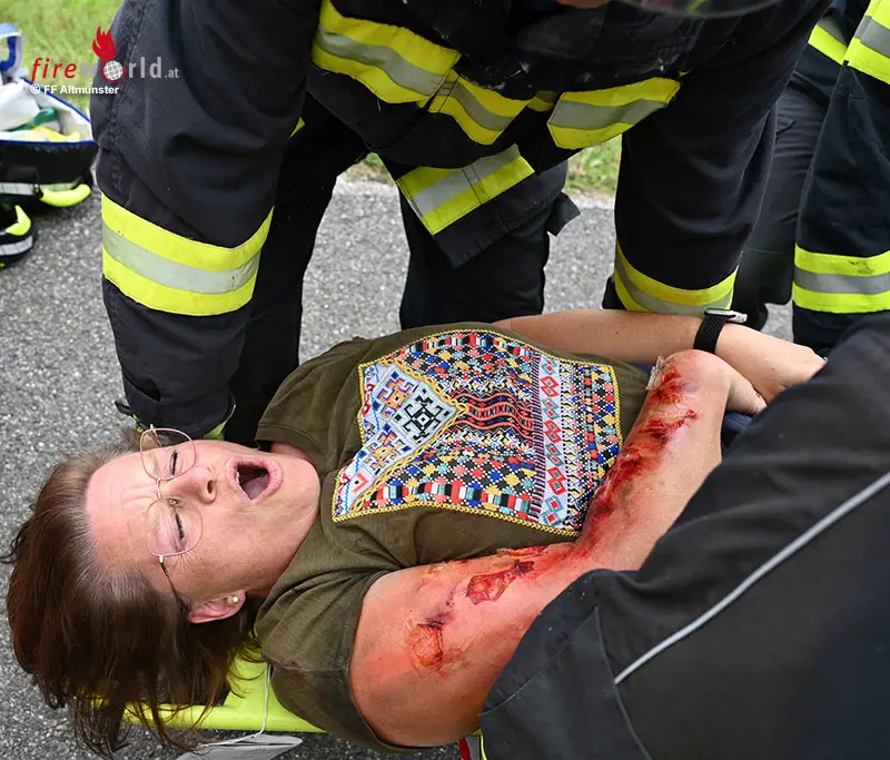 Die Übung begann bereits am frühen Vormittag im Sicherheitszentrum Altmünster, wo die Statisten von einer Mitarbeiterin des Roten Kreuz mit realistischen Wunden „versorgt“ wurden. Zunächst rückte das Rote Kreuz mit einem Großaufgebot an. Kurz darauf trafen die Feuerwehren Altmünster, Neukirchen, Reindlmühl und Eben/Nachdemsee ein. Für die Bergungsarbeiten wurde zusätzlich die Feuerwehr Vöcklabruck mit dem Kran angefordert. Insgesamt standen 18 Feuerwehrfahrzeuge mit 76 Kräften sowie 7 Rettungswagen mit 20 Sanitätern im Einsatz.