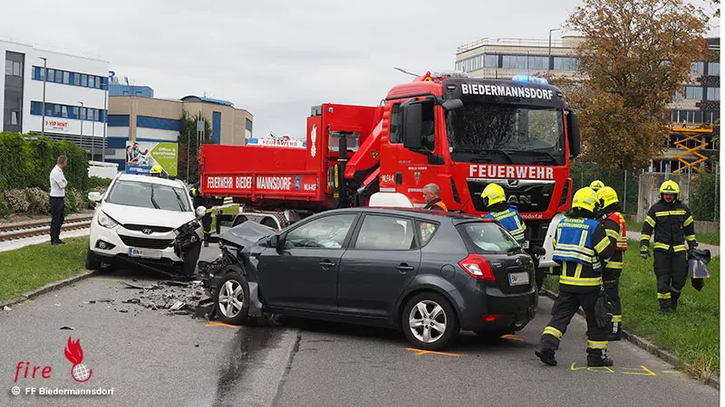 BIEDERMANNSDORF (NÖ): In den frühen Nachmittagsstunden des 23. September 2025 stießen auf einer langen geraden Straße im IZ NÖ-SÜD in Biedermannsdorf zwei Pkw frontal zusammen.