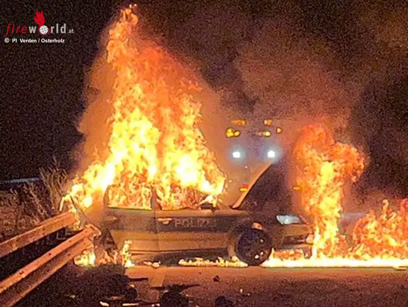 D: Absicherndes Polizeifahrzeug auf A 1 gerammt und in Flammen