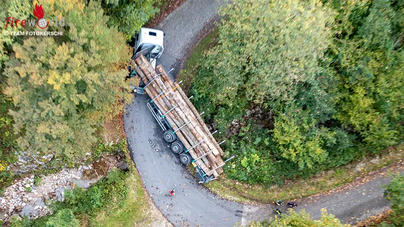 Ein vollbeladener Sattelschlepper mit Langholzstämmen war in einer engen Rechtskurve von der Fahrbahn abgekommen und drohte seitlich abzustürzen.