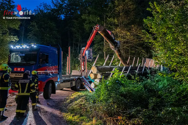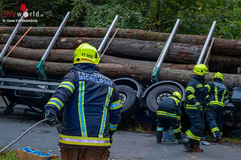 Oö: Aufwendige Bergung eines umgestürzten Holz-Sattelschleppers in Molln