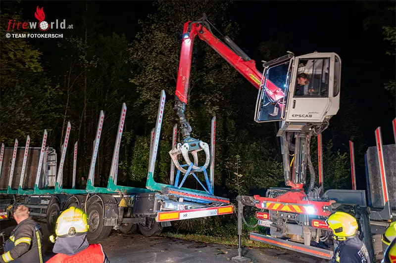 Zusätzlich wurde ein Holztransportunternehmen hinzugezogen, um die geladene Fracht sicher umzuladen und somit das Fahrzeug zu entlasten.