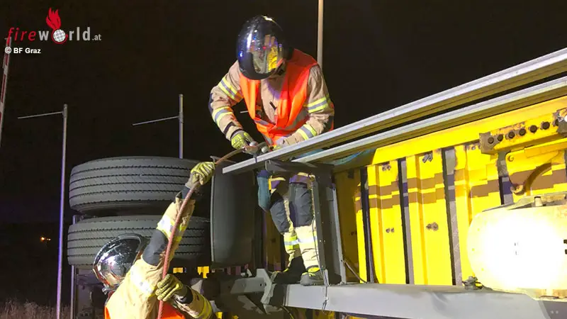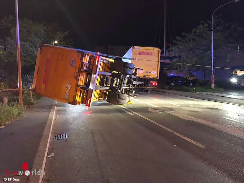 Stmk: Umstürzender Lastwagen-Anhänger fällt in Graz auf Pkw