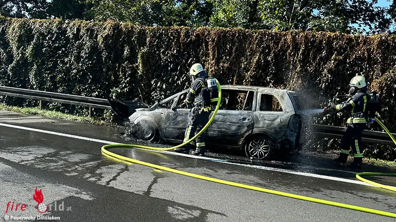 Kurz vor dem Ende des Einsatzes auf der Hügelstraße erfolgte die nächste Alarmierung der Feuerwehr. Diesmal ging es zur BAB 3. Dort brannte ein Pkw auf dem Standstreifen sowie Teile der Böschung.