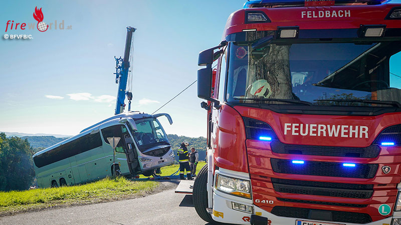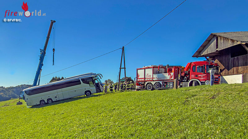 GNAS (STMK): Ein mit 35 Personen besetzter Reisebus geriet in der Nacht auf Freitag, dem 3. Oktober 2025, in Baumgarten (Gemeinde Gnas) beim Zurücksetzen von einer Gemeindestraße ab und rutschte auf eine steil abfallende Wiese.
