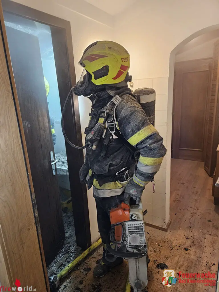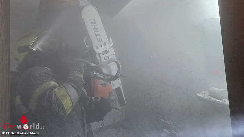 Ein Atemschutztrupp der Feuerwehr Bad Kleinkirchheim drang unverzüglich mit einer Löschleitung über das Hauptstiegenhaus in den verrauchten Bereich vor. Dort konnte in einem Badezimmer ein Brand in der Dachkonstruktion lokalisiert werden. Unter schwerer körperlicher Anstrengung wurde der betroffene Bereich mit einer Rettungssäge geöffnet und der Brand abgelöscht.