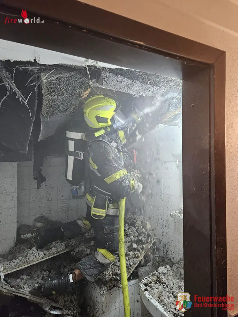 Für die weitere Kontrolle und Nachlöscharbeiten mussten zusätzliche Teile der Dachkonstruktion geöffnet werden. Insgesamt standen zwei Atemschutztrupps der Feuerwehr Bad Kleinkirchheim im Einsatz.