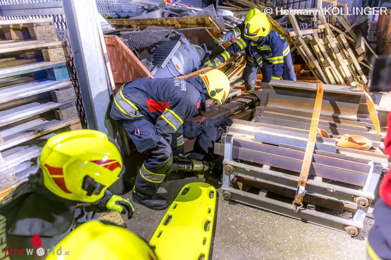 Angenommen wurde, dass es bei Arbeiten an einer Metallkonstruktion zu einem Unfall gekommen ist, in dem drei Arbeiter involviert sind. Ein Mann erlitt eine Pfählung durch eine Metallstange, zwei weitere Männer wurden unter schweren Metallteilen eingeklemmt. Ein Teil der anrückenden Mannschaft kümmerte sich um die Person mit der Stange im Körper.