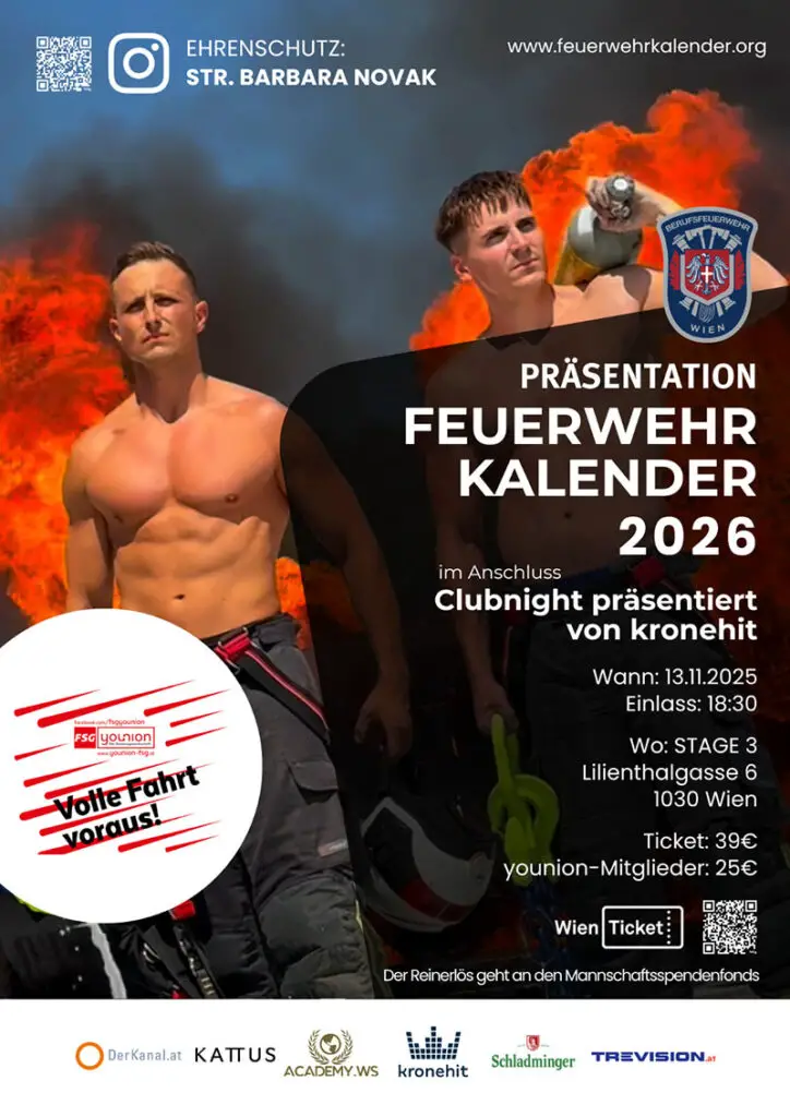 Wie jedes Jahr stellten sich auch heuer wieder Kollegen der Berufsfeuerwehr Wien für einen guten Zweck vor die Kamera. Der begehrte Feuerwehrkalender 2026 wird am 13. November 2025 im Stage 3 feierlich präsentiert und kann im Rahmen der Veranstaltung direkt vor Ort erworben werden. Im Anschluss an die Präsentation findet ein Clubbing – presented by kronehit statt. Der Einlass beginnt um 18:30 Uhr. Tickets sind ab 25 Euro erhältlich. Die Veranstaltung steht unter dem Ehrenschutz der Wiener Stadträtin Barbara Novak, MA.