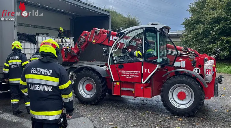 Stmk: Tragehilfe und rauchender Gefahrgutbehälter auf Lkw in Langenwang
