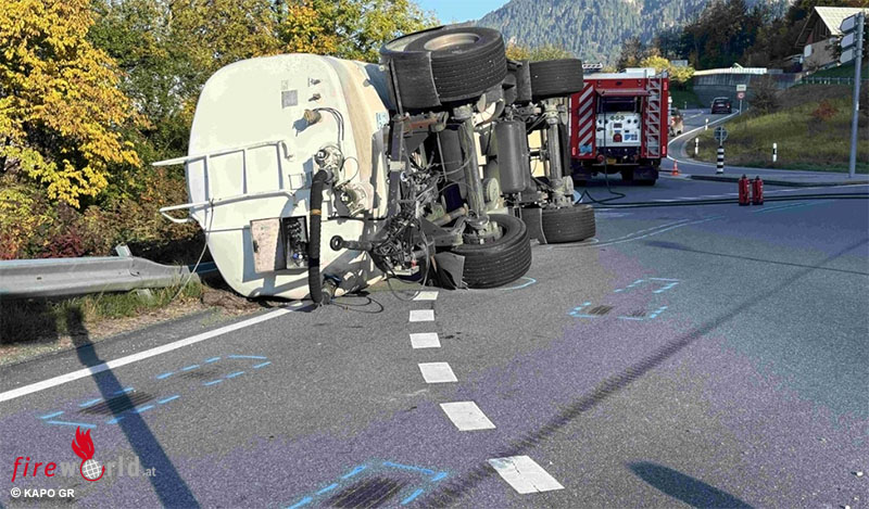 ILANZ / GLION (SCHWEIZ): Am Freitagnachmittag, dem 10. Oktober 2025, kippte ein Tankanhänger in Ilanz. Niemand wurde verletzt, aber hoher Sachschaden entstand. Die Polizei untersucht die Ursache.
