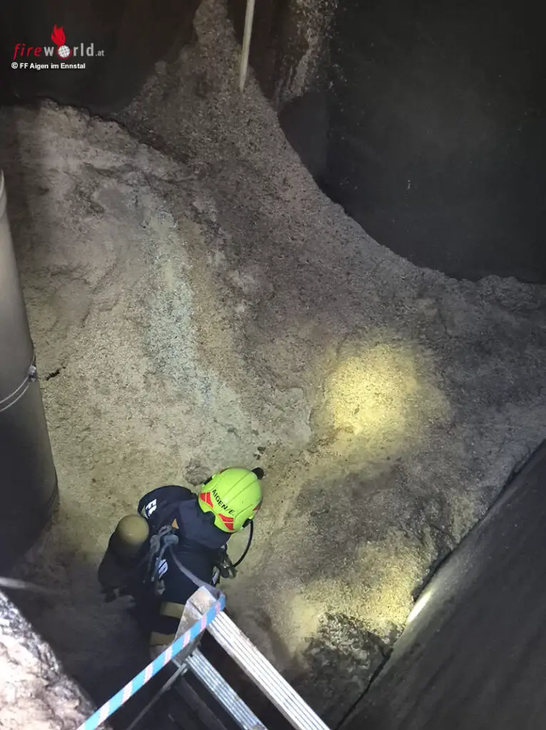 Unmittelbar nach der Alarmierung rückten die Feuerwehren Aigen im Ennstal, Lantschern und Stainach mit insgesamt 6 Einsatzfahrzeugen und rund 40 Feuerwehrmitgliedern zum Einsatzort aus. Auch Polizei, Rettung sowie ein Brandermittler waren vor Ort. Im Silo des Betriebs, in dem rund 60 m³ Sägespäne gelagert waren, hatte sich ein Glutnest gebildet, das sich über den gesamten Turm ausbreitete.