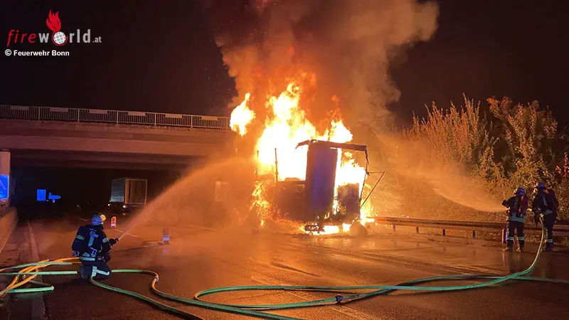 Die Einsatzstelle konnte dann an die Kräfte der Feuerwehr Troisdorf übergeben werden, die in enger Abstimmung mit der Polizei die weitere Abarbeitung der Einsatzstelle übernahmen. Während den Löschmaßnahmen wurde die Fahrbahn in Fahrtrichtung Köln voll gesperrt. Verletzt wurde niemand.