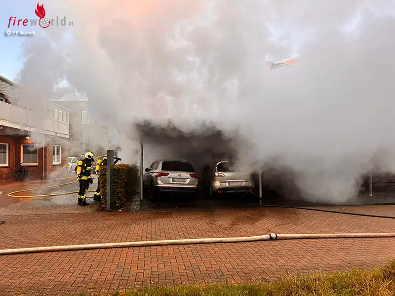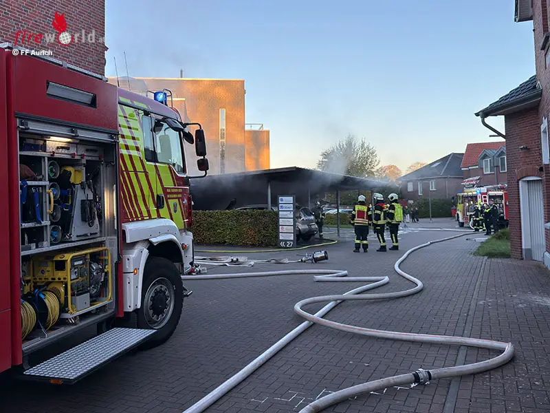 AURICH (DEUTSCHLAND): Zwei unter einem Carport abgestellte Fahrzeuge standen am Samstagmorgen, 18. Oktober 2025, im Collmannsgang in Aurich in Flammen. Als die ersten Einsatzkräfte der Feuerwehr Aurich vor Ort eintrafen, griff das Feuer bereits auf die angrenzende Holzkonstruktion des Unterstandes über.