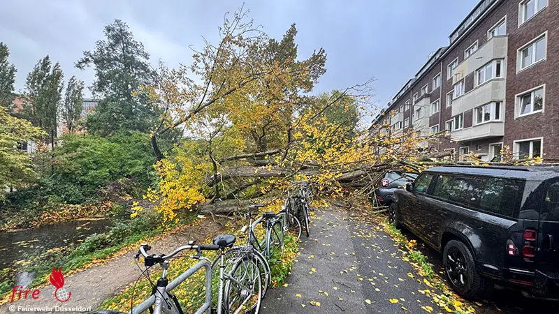 DÜSSELDORF (DEUTSCHLAND): Auf der Feuerbachstraße in Düsseldorf stürzte am Donnerstagnachmittag, 23. Oktober 2025, ein rund 50 Meter hoher Baum auf die Fahrbahn und begrub neun geparkte Pkw unter sich. Durch die Wucht beschädigte der Baum drei Fenster der nahe gelegenen Wohnbebauung. Verletzt wurde bei dem Unfall niemand. Die Feuerwehr beseitigte ein Teil des Baumes, sodass der Gehweg nutzbar und die Feuerbachstraße wieder befahrbar sind.