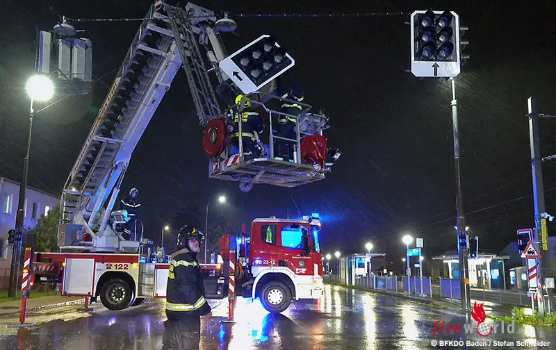 Zweimal hieß es bislang dann für die Freiwillige Feuerwehr Möllersdorf zur Gefahrenabwehr auszurücken. Bei der ersten Alarmierung um 19.30h kam von der Feuerwehrbereichsalarmzentrale BADEN die Zusatzmeldung „Baustellenklo fliegt herum“. Um 19.42 Uhr erhielten sie bereits die nächste Meldung. Auf der B17 hielt die Abspannung einer Verkehrsampel den heftigen Sturmböen nicht stand. Die Sicherungsarbeiten der FF Möllersdorf wurden durch die Teleskopmastbühne der FF Traiskirchen-Stadt unterstützt. Eine Polizeistreife leitete währenddessen den Verkehr um.