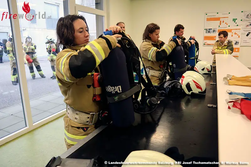 SALZBURG (SBG): Die Atemschutzleistungsprüfung in den verschiedenen Leistungsstufen wird jedes Jahr im Frühjahr und Herbst an der Landesfeuerwehrschule Salzburg abgenommen. Die zahlreichen Teilnehmer müssen das Können als Atemschutzgeräteträger unter Beweis stellen.