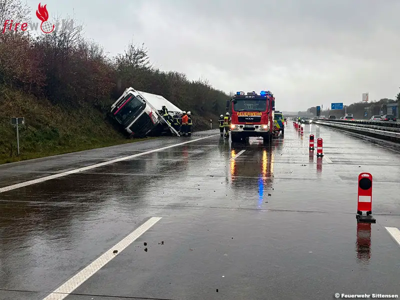 SITTENSEN (D): Am Sonntagmittag, den 26. oktober 2025, kam es auf der Autobahn 1 in Fahrtrichtung Hamburg zwischen der Anschlussstelle Sittensen und der Rastanlage Ostetal Süd kurz vor 12 Uhr zu einem Verkehrsunfall. Ein Lkw und ein VW kollidierten miteinander. Der Lkw kippte um und blieb seitlich am Lärmschutzwall liegen.