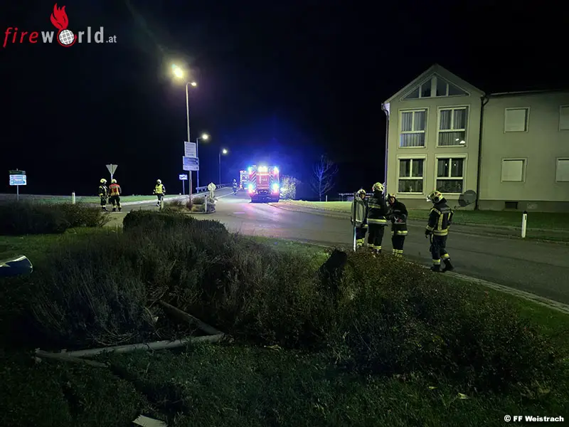 WEISTRACH (NÖ): Am Abend des 26. Oktober 2025 wurde die Freiwillige Feuerwehr Weistrach zu einem Pkw im Graben auf die LH 85 alarmiert. Bei der Lageerkundung stellte sich heraus, dass ein Lenker geradeaus über den Weistracher Kreisverkehr fuhr und rechts der Leitschiene zum Stillstand kam.