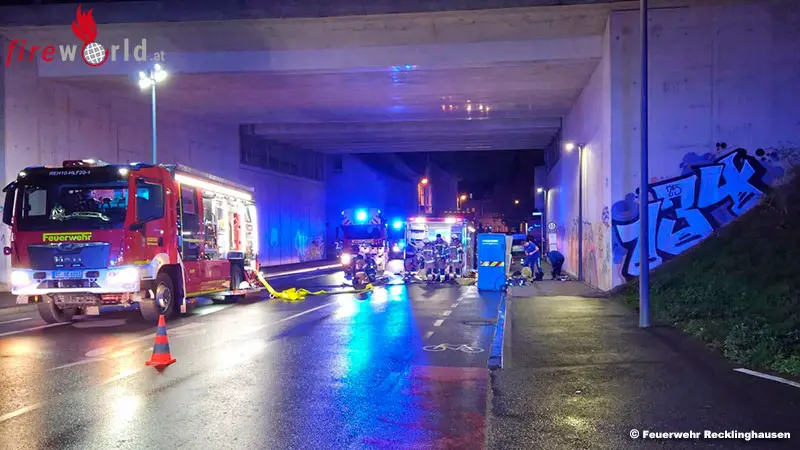 RECKLINGHAUSEN (D): Die Feuerwehr Recklinghausen wurde am Montagabend, den 27. Oktober 2025, um 18.41 Uhr mit dem Stichwort „Gewerbe – Brand klein“ in die Hochlarmarkstraße nach Recklinghausen-Hochlarmark alarmiert. Nach ersten Meldungen sollte eine Lagerhalle mit gelagerten Dachpappen brennen.