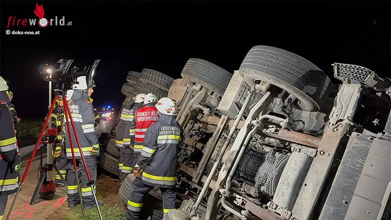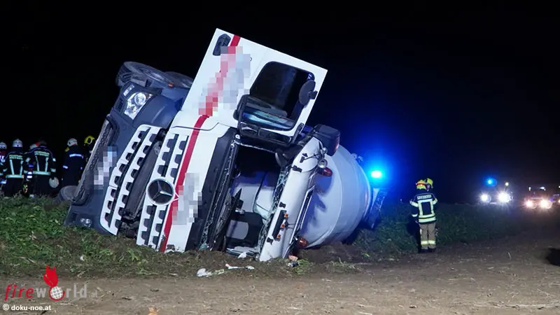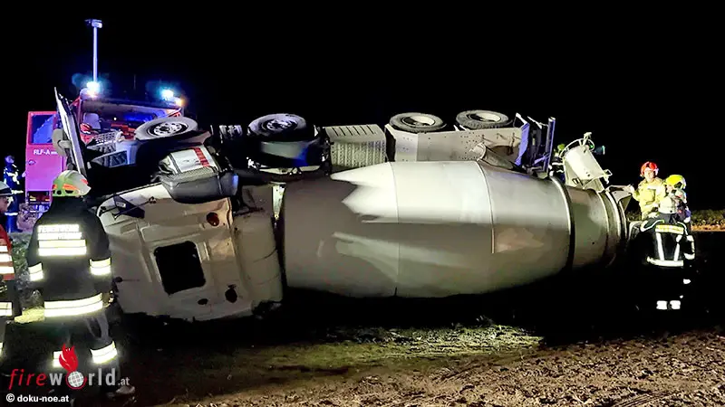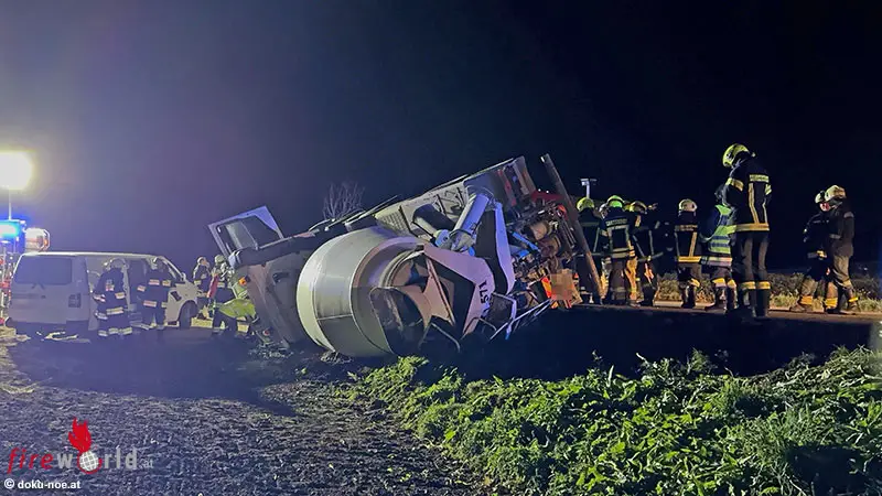 Nö: Voll beladener 4-Achs-Betonmischer über Straßenböschung gestürzt → Lenker über Windschutzscheibe befreit