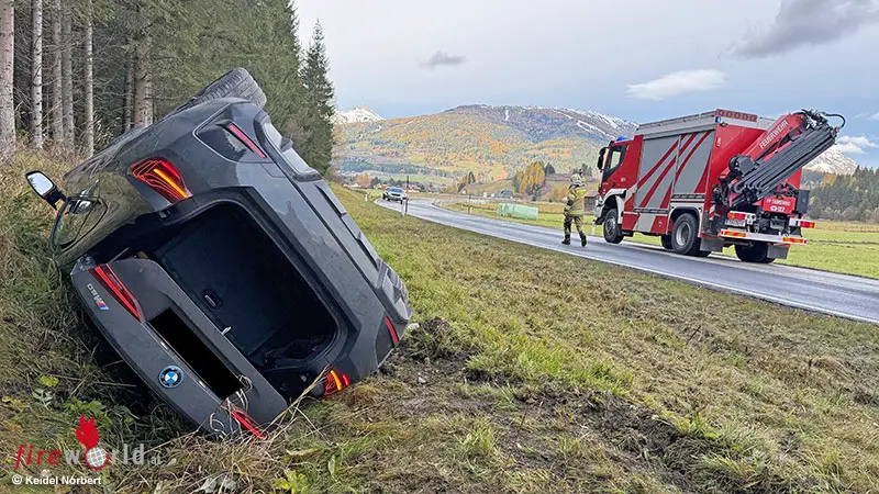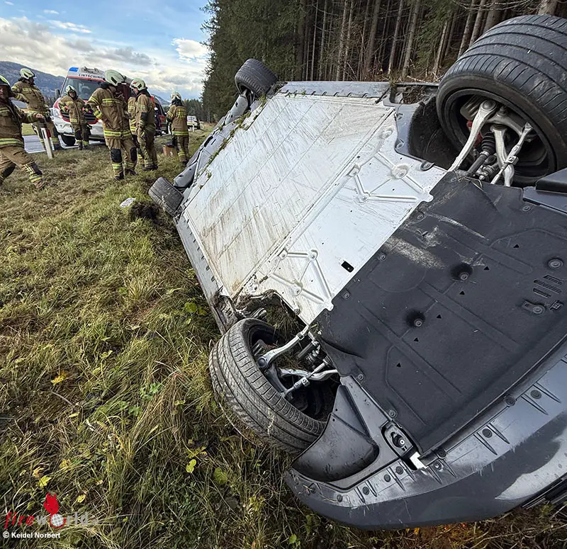 Ein Pkw war aus bislang unbekannter Ursache von der Fahrbahn abgekommen und kam am Dach liegend zum Stillstand. Beim Eintreffen der Einsatzkräfte wurde festgestellt, dass sich keine Person mehr im Fahrzeug befand – der Lenker wurde bereits vom Roten Kreuz versorgt. Beim verunfallten Pkw handelte es sich um ein Elektrofahrzeug.
